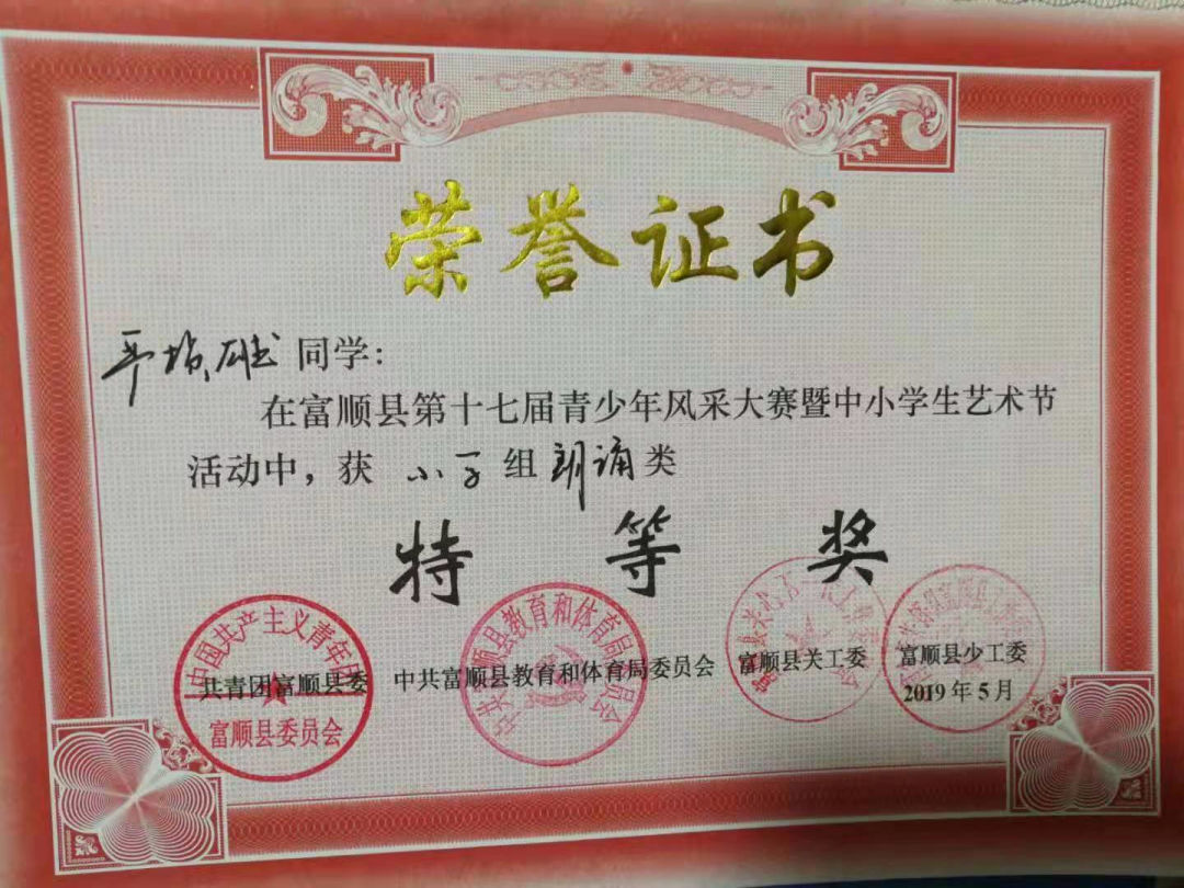 獲得縣青少年風采大賽暨中小學生藝術節朗讀特等獎。