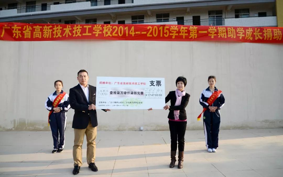 廣東省高新技術(shù)高級(jí)技工學(xué)校發(fā)展基金會(huì)成立于2012年,由張?zhí)炫嘈iL(zhǎng)發(fā)起,基金會(huì)堅(jiān)持中國(guó)共產(chǎn)黨的領(lǐng)導(dǎo),踐行社會(huì)主義核心價(jià)值體系,遵守社會(huì)風(fēng)尚,堅(jiān)持以“資助品學(xué)優(yōu)良的特困學(xué)生,幫助他們擺脫困境,激勵(lì)他們發(fā)奮讀書(shū)、立志成才;全力關(guān)愛(ài)困難教職工,傳遞溫暖、愛(ài)心互助”為愿景。2014年,張?zhí)炫嘈iL(zhǎng)向基金會(huì)捐助17.5萬(wàn)元。