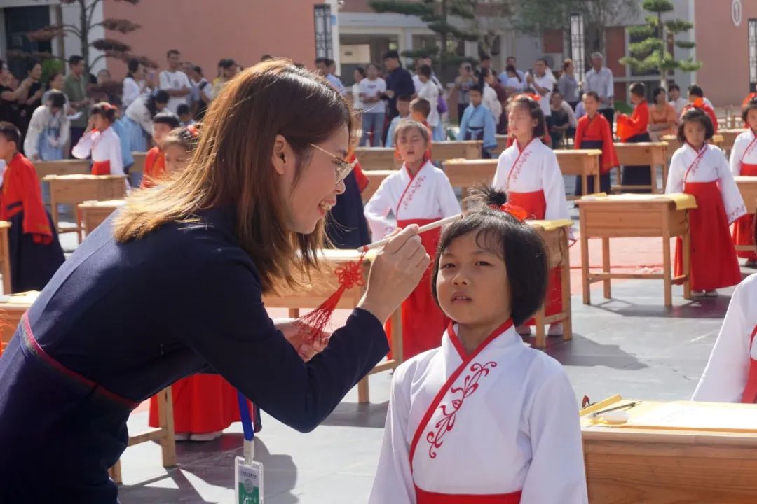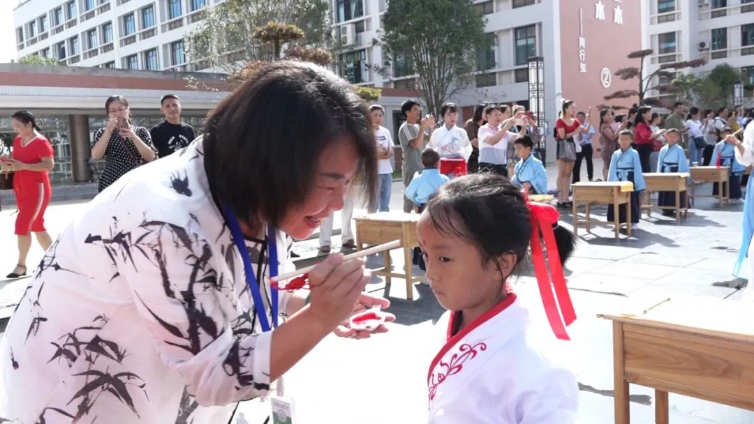 學(xué)校領(lǐng)導(dǎo)和老師們俯下身子,笑意盈盈地逐個為孩子們點朱砂,一張張稚氣的臉上多了一分靈氣和自信。