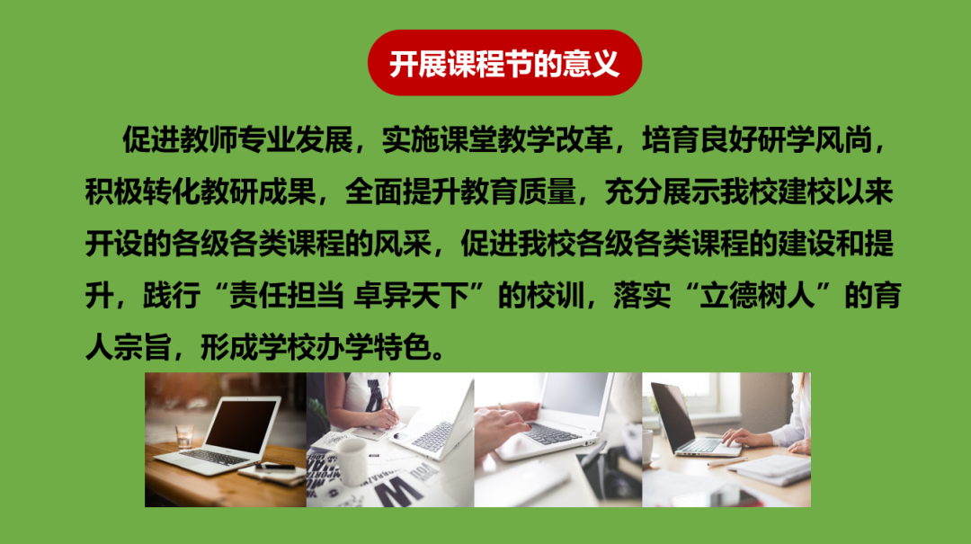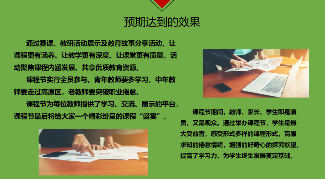 吳燕校長首先從課程節(jié)的意義出發(fā),讓大家明確了課程節(jié)開展的重要意義。然后從國家級課程展示、地方課程展示及校本課程展示、大課堂展示、優(yōu)秀教研活動展示、班主任班會課比賽、家長講堂、優(yōu)秀校本課程匯展及匯演等七個(gè)方面進(jìn)行了具體的闡述,讓大家找到了落實(shí)的方向。最后吳燕校長對本次課程節(jié)的圓滿進(jìn)行表達(dá)了衷心的祝愿和滿滿的期待。她表示:本次課程節(jié)為每位教師提供了學(xué)習(xí)、交流、展示的平臺,最后將給大家一個(gè)精彩紛呈的課程“盛宴”。課程節(jié)期間,教師、家長、學(xué)生即是演員,又是觀眾。通過舉辦課程節(jié),學(xué)生是最大受益者,感受形式多樣的課程形式,克服求知的倦怠情緒,增強(qiáng)的好奇心的探究欲望,提高了學(xué)習(xí)力,為學(xué)生終生發(fā)展奠定基礎(chǔ)。