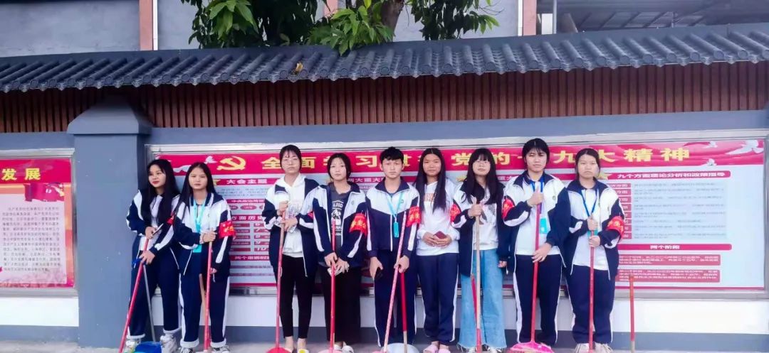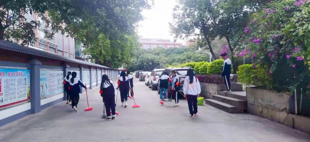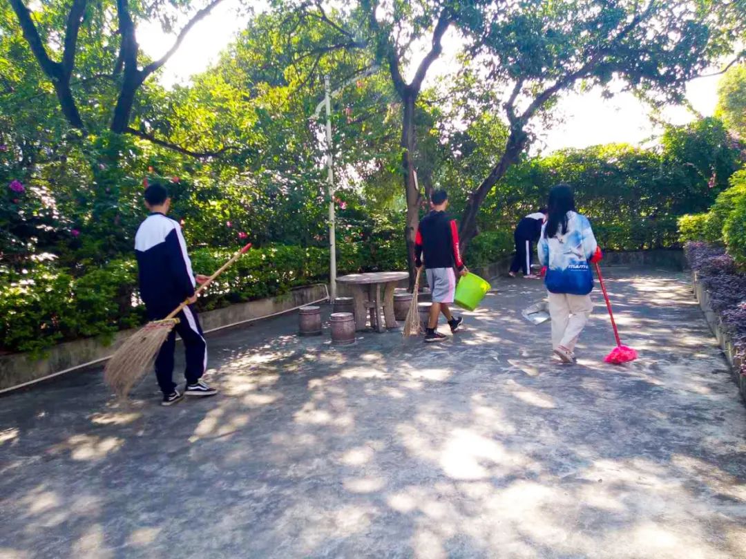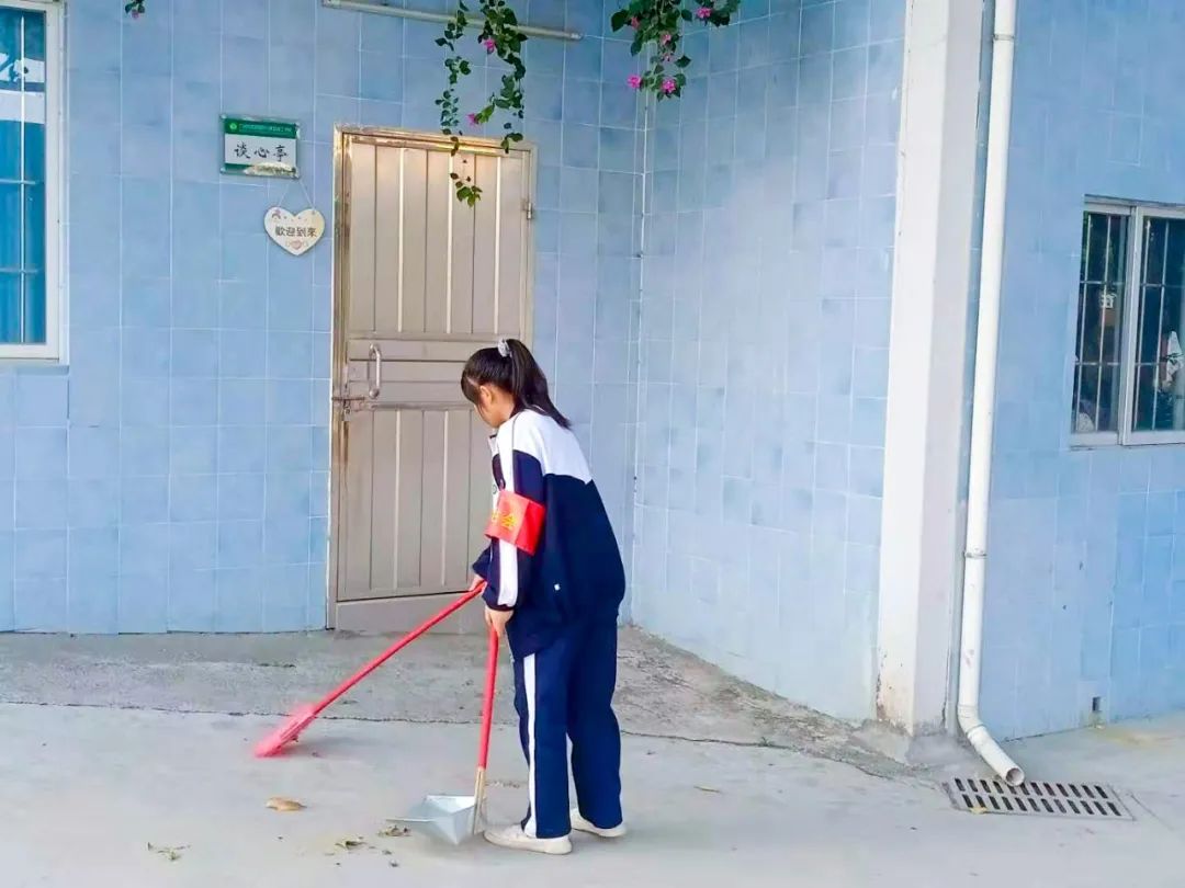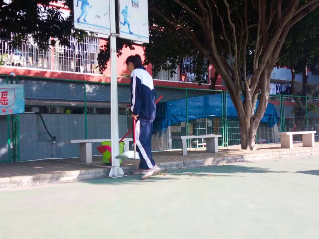 提前到達(dá)操場(chǎng)的是王廷榮、黃詩(shī)文、李仁懷、李燦彬、溫善媛等同學(xué)。他們揮動(dòng)著掃把便開(kāi)始“沙沙”地清掃落葉,掃地的聲音好像鳥(niǎo)兒在對(duì)他們唱歌,又像是在鼓勵(lì)他們:“勞動(dòng)的孩子最美麗”。